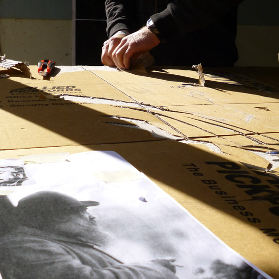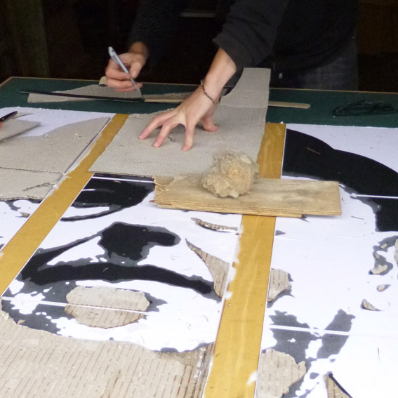 Large scale collagraphs were produced using backing boards rescued from the closure of the Trents spice, herb and baking goods processing plant in Dunedin and recycled cardboard. Day one out on the lawn was sunny and warm so good progress was made on assembling the collagraphs. The temperature turned and down came the rain that evening so day two was spent printing on top of the pool table inside to great results. Thanks go to Neil Emmerson for organising the project and Steev Peyroux for his technical support.